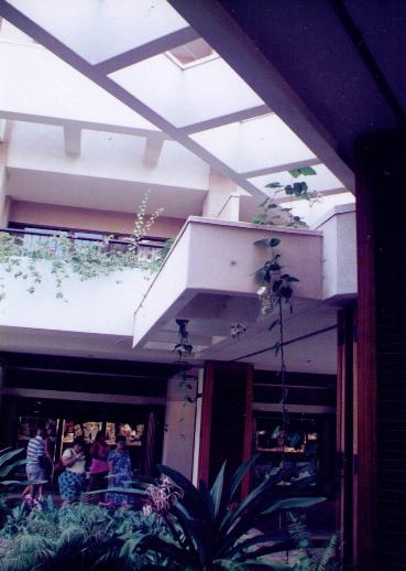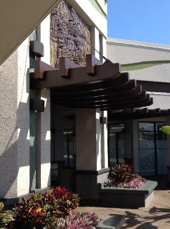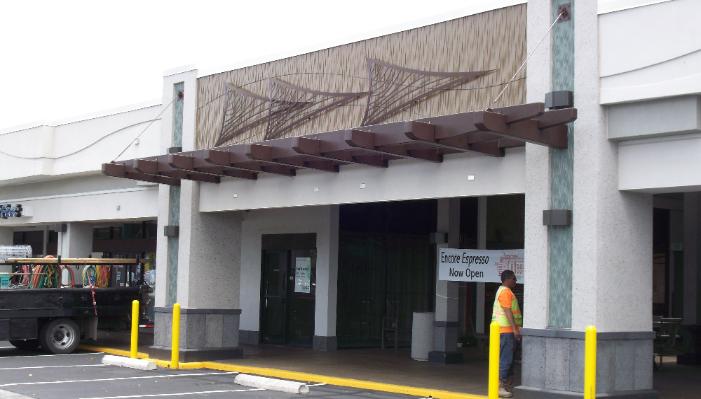 Trellis at entrance to Food Court at Aina Haina Shopping Center. Trellis beams continue at food court ceiling area beyond parapet wall.