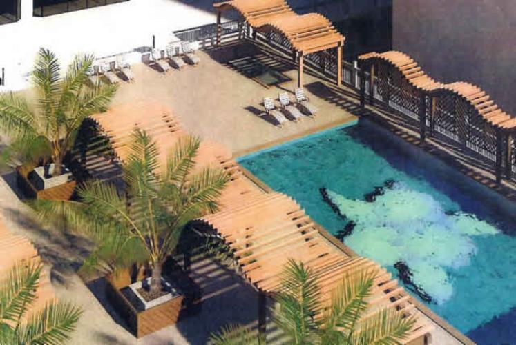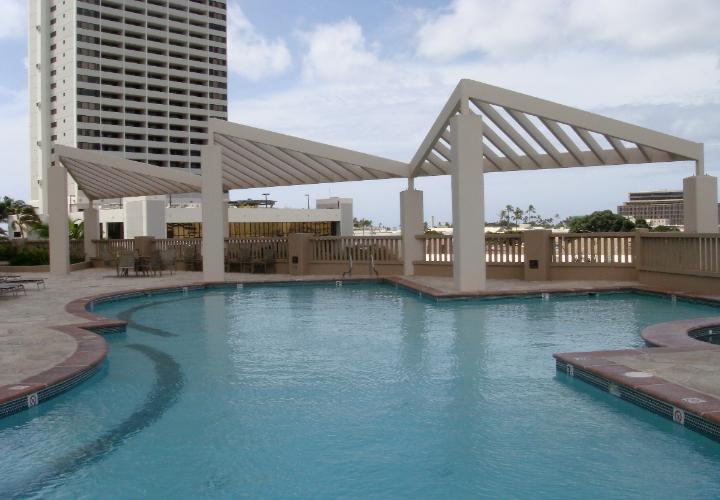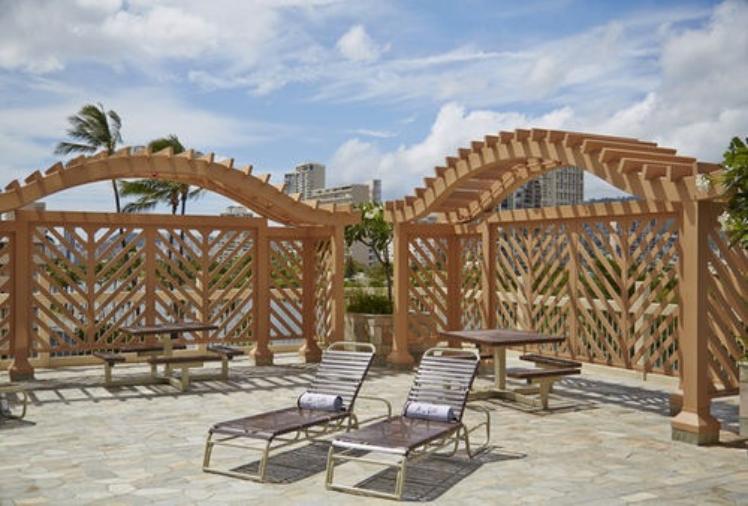 FRP trellis cladding at pool deck. Hilton Grand Islander, Waikiki.