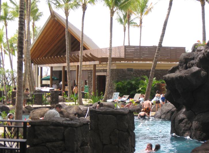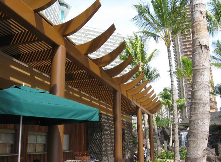 FRP trellis with upturned outrigger style ends, Hilton Grand Waikikian poolside restaurant, Hawaii