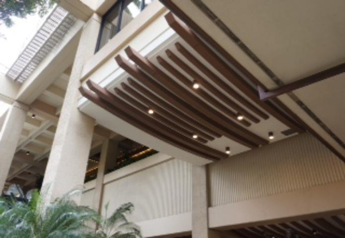 FRP trellis, beam cover, roof outrigger ends, and roof ridge cap, Hilton Grand Waikikian poolside restaurant.